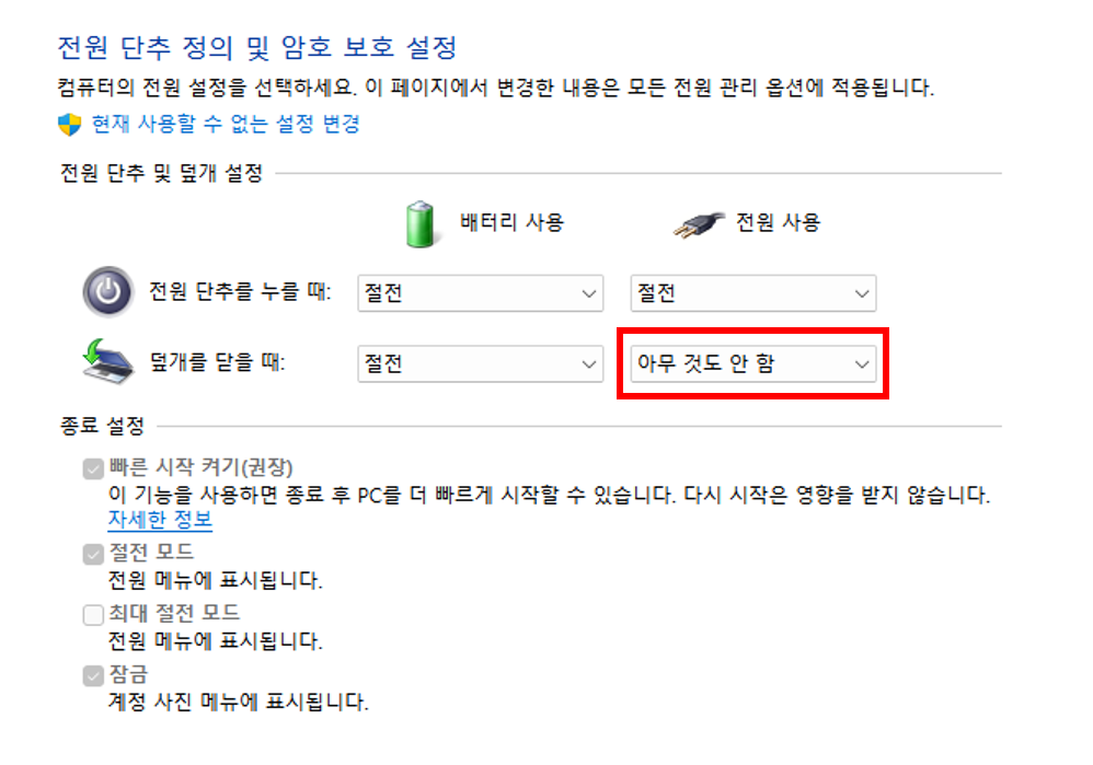 그럴 땐, '덮개' 라고 검색에 타이핑해서 덮개를 닫을 때 옵션을 아무것도 안함으로 바꿔 준다.