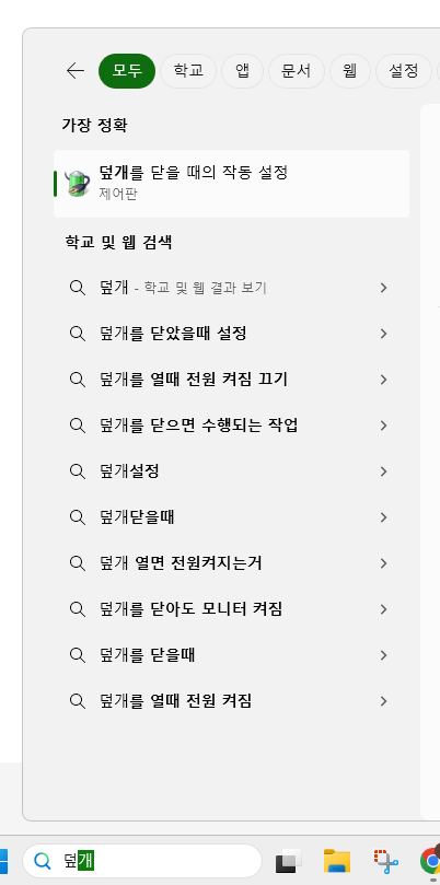 그럴 땐, '덮개' 라고 검색에 타이핑해서 덮개를 닫을 때 옵션을 아무것도 안함으로 바꿔 준다.