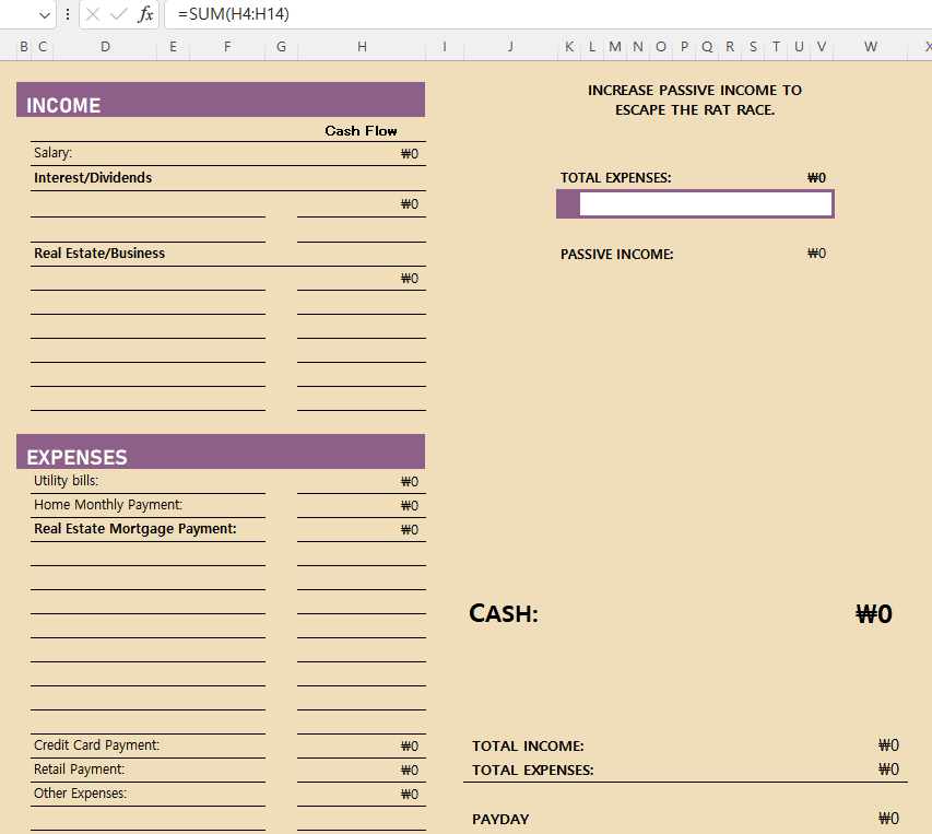 재테크에 입문함과 동시에 재밌게 플레이했던 캐시플로 게임에서 사용했던 표가 생각나서 만들어보았습니다.