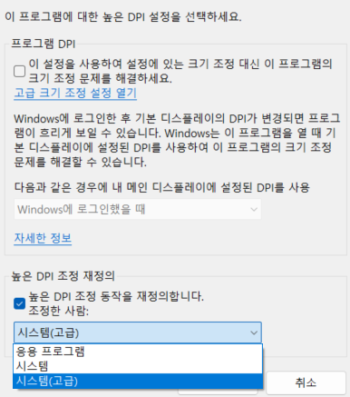 특정 프로그램이 확장 모니터에서 아래처럼 흐리게 보인다.
