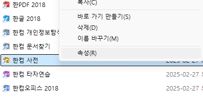 2. 해당 프로그램 우클릭-추가옵션표시-속성 클릭