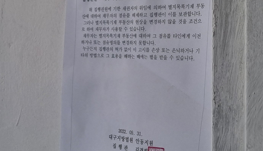 위 사진에 붙은 공고문은 필자가 명도를 위해 붙인 점유이전금지가처분 고시이다.