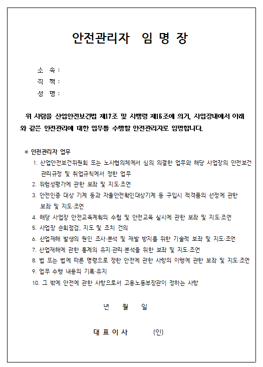 안전관리자를 선임한 경우엔 동 법에 따라 고용노동부에 선임신고서를 제출해야 하므로,