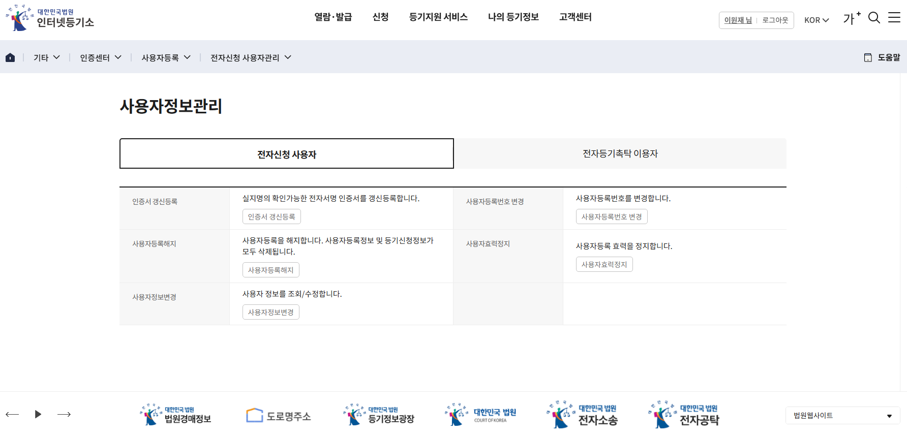 그러나 메일에서 안내하는대로 로그인 후 전자신청사용자 탭에 들어갔음에도 불구하고