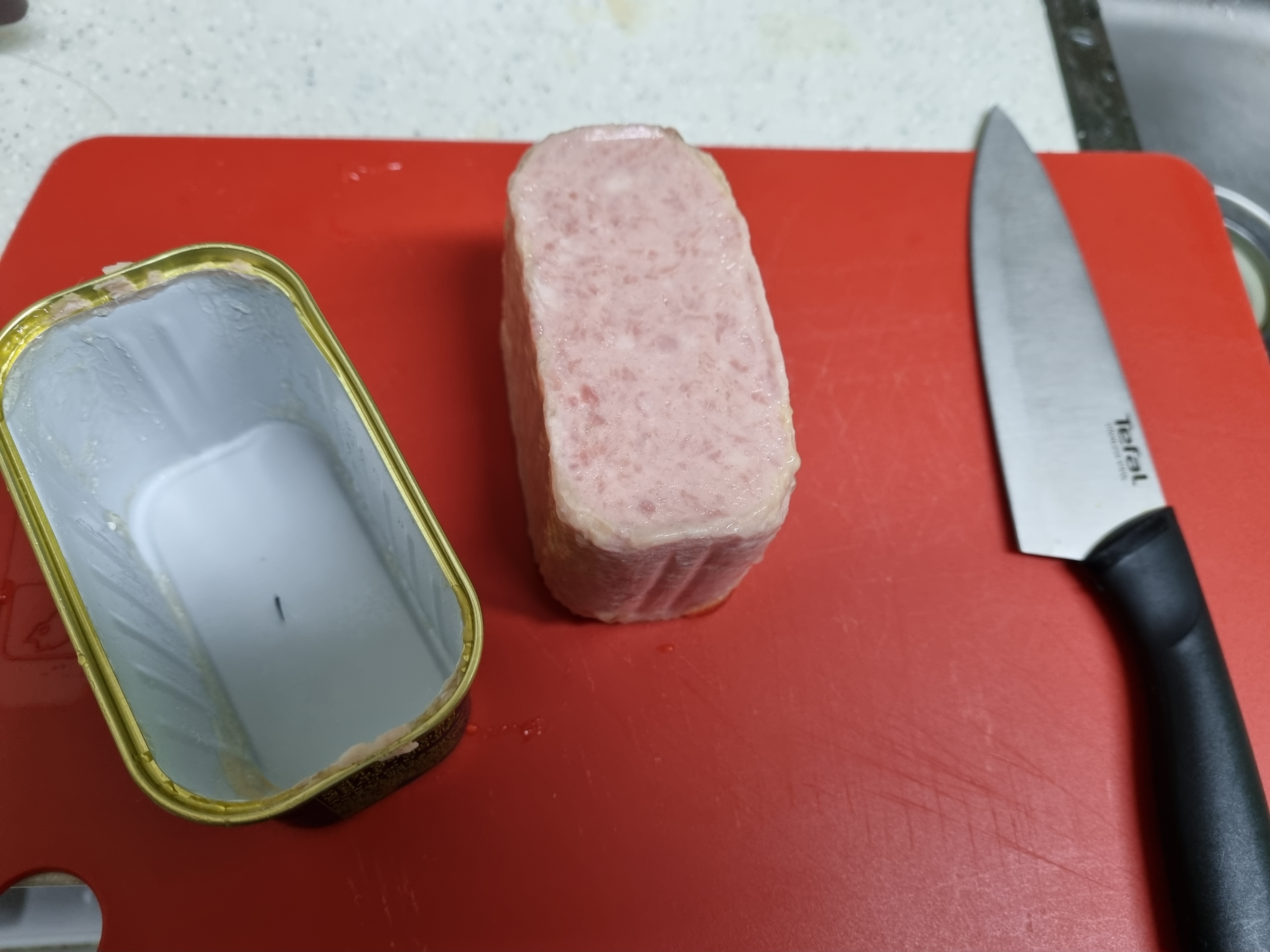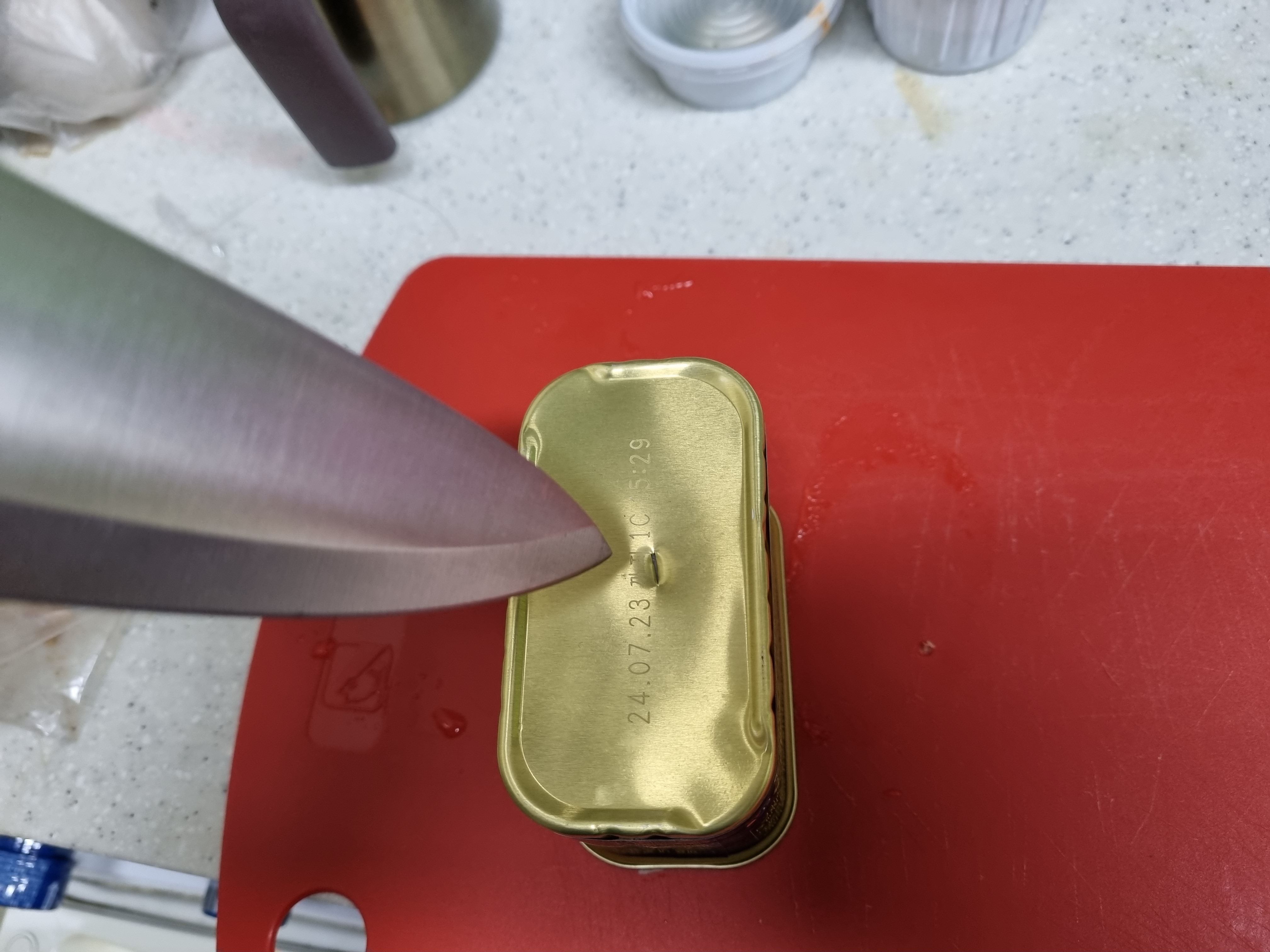 스팸을 썰 칼로 용기 뒷부분을 가볍게 한번 찍어주면 쉽게 구멍을 뚫을 수 있다.