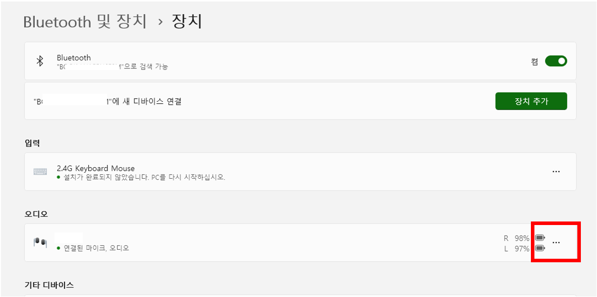 무선이어폰이 연결되었음에도 불구하고 한쪽에서만 소리가 들리는 경우 해결책은 다음과 같다. 우선 블루투스 장치 관리페이지에 들어가주자.