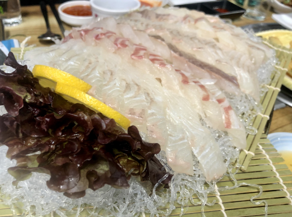 2. 도매점에서 숭어 자연산광어 도다리 참돔 등 구매, 해동수산 가서 키로당 5천주고 회뜬다.