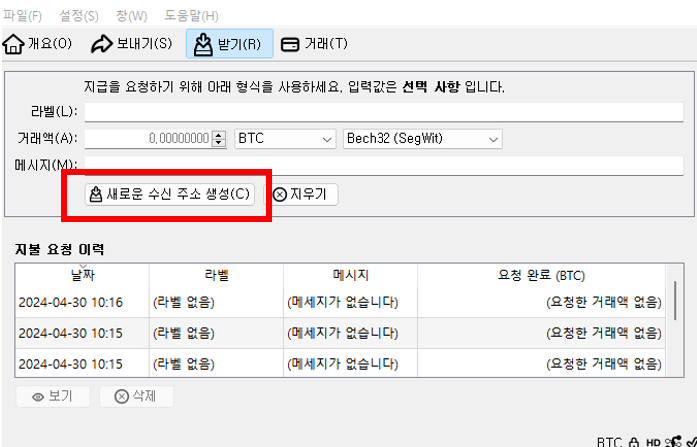 받기 탭에 들어가서 새로운 수신 주소 생성을 눌러준다. 그러면