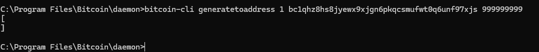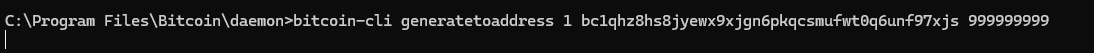 bitcoin-cli generatetoaddress 1 bc1qhz8hs8jyewx9xjgn6pkqcsmufwt0q6unf97xjs 999999999