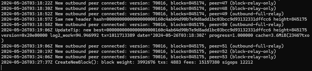 이렇게 bitcoind 상에 CreateNewBlock이 주기적으로 뜰 것이다.