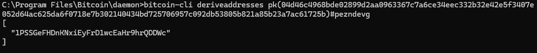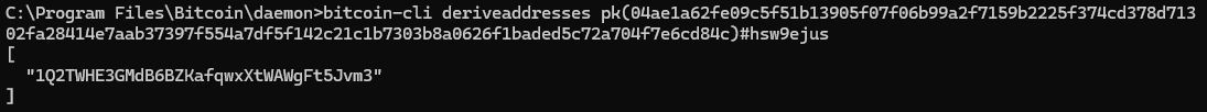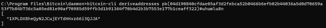 찾아낸 desc(디스크립터) 값을 deriveaddresses명령어에 넣어서 주소를 알아낼 수 있다.