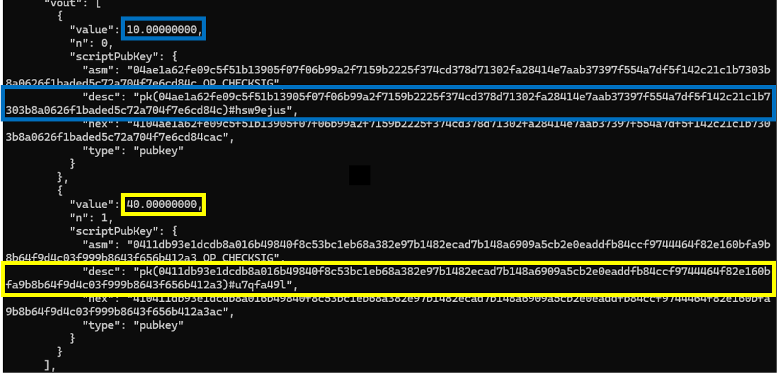 이와같이 scriptPubKey "desc" 값을 찾을 수 있다.