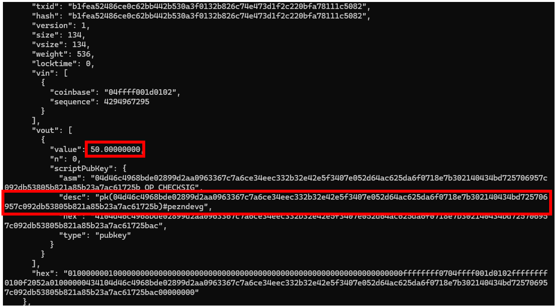 채굴보상으로 비트코인 50개가 생성되었을 때 디스크립터 값은 pk(04d46c4968bde02899d2aa0963367c7a6ce34eec332b32e42e5f3407e052d64ac625da6f0718e7b302140434bd725706957c092db53805b821a85b23a7ac61725b)#pezndevg이다.