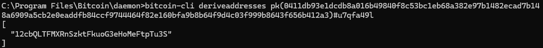 deriveaddresses 명령어와 해당 디스크립터 값으로 50개의 비트코인이 전송된 주소를 알아보자.