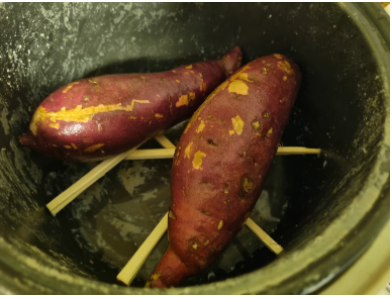 뚜껑을 열어 고구마를 젓가락으로 찔러보았더니 푸욱 들어간다.
