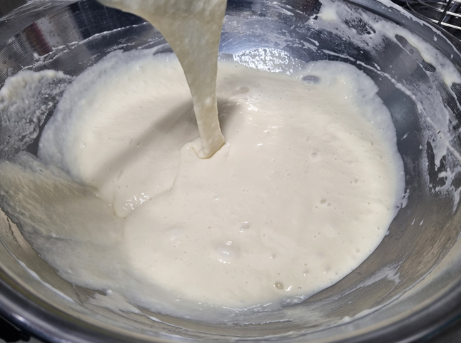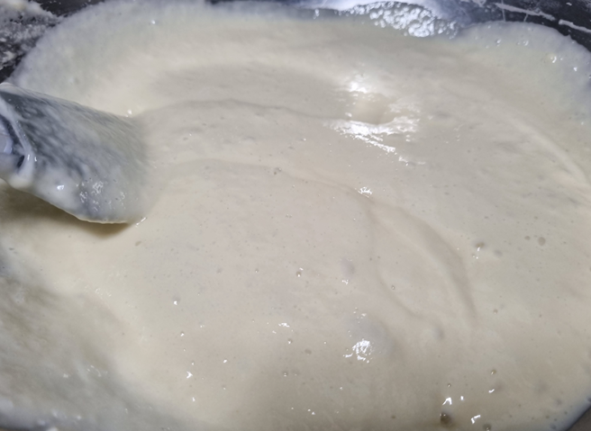 3. 밀가루 0~2T로 농도를 맞춰 줍니다. 주르르 흐르며 쌓이는 핫케익반죽 정도면 됩니다. 이후 35도 정도에서 30분 발효.