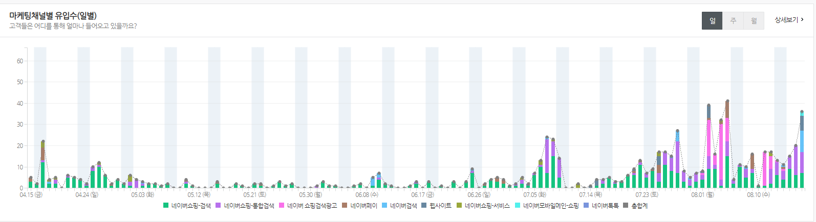 유입수는 일 20언저리다. 많게는 40까지 치솟기도 했는데, 시험삼아 달아본 50원짜리 쇼핑검색광고에 의한 것이므로 예외처리 하는것이 좋겠다.