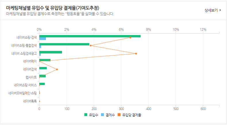 위 그래프에서 볼 수 있듯이, 네이버쇼핑에서 검색해서 스토어로 들어온 고객 중 6퍼센트가 결제를 진행했다.