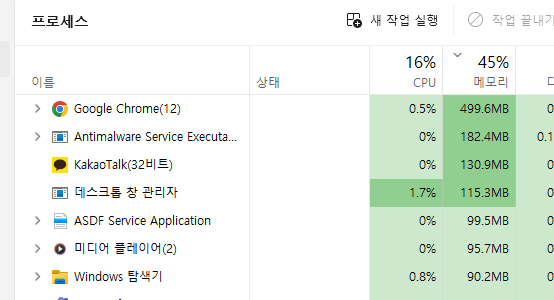 렉이 발생하면 늘 들어가는 작업관리자를 보았으나 아무런 문제가 없었다.