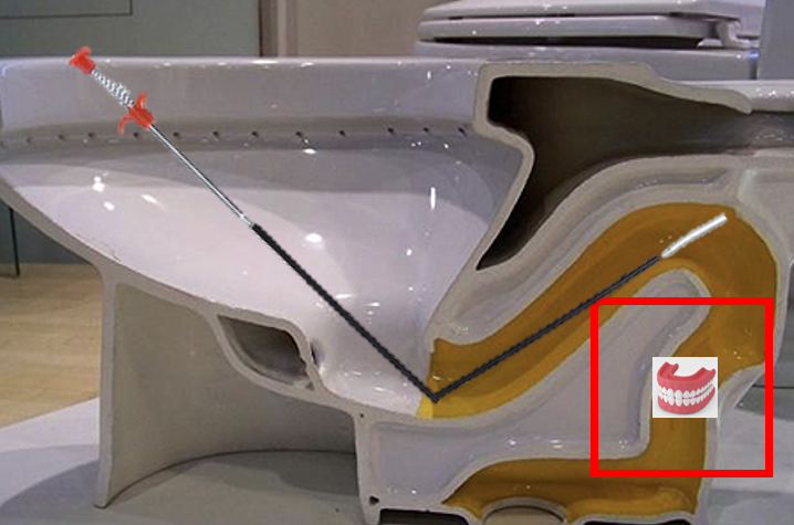 뚫어뻥을 사용하는 것은 틀니가 배관에 더 단단하게 끼이는 일을 초래하여 상황을 악화시킬 것이다.