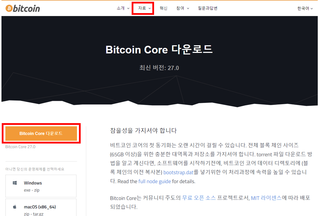 위 웹사이트의 자료 탭에서 bitcoin core를 클릭해서 Bitcoin Core 다운로드 버튼을 눌러주자.
